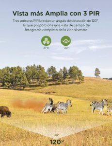 - Velocidad de Disparo Ultrarrápida y Amplio Rango de Detección: Gracias a sus tres sensores PIR mejorados, la velocidad de disparo de la cámara puede alcanzar los 0.2 segundos, asegurando que no se pierda ningún movimiento significativo. Un amplio rango de detección de 120° mejora el rendimiento de la cámara en la captura precisa y efectiva de movimientos.