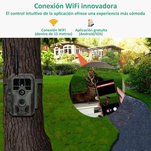 - Conexión WiFi Innovadora: La cámara de caza GardePro E8 incluye un módulo WiFi de bajo consumo que permite conectarla rápidamente a smartphones tanto Android como iOS. Gracias a la aplicación intuitiva, es posible verificar el área de grabación, obtener una vista previa y descargar galerías o ajustar configuraciones de la cámara directamente desde su dispositivo móvil.